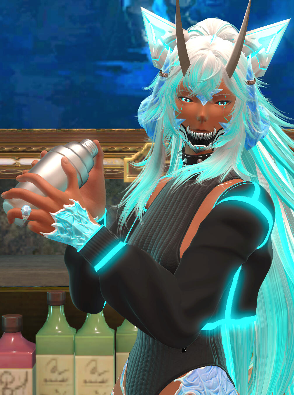Vyse was found trapped and sleeping deep in an ice field in Northern Garlemald, where she was quickly brought in for testing and experimentation due to her unique appearance and situation of being found. It was quickly discovered she had a natural affinity towards ice magic. She would freeze anything she touched, had a body temperature well below freezing at all times, and would unconsciously imbue any attack with deadly cold. The Garleans, wanting to learn how to control her powers and use her as a weapon, added piercings to her body, which while greatly increased her ability to control her magic also had the side effect of spiking her libido to insane levels. After years of constant experimentation she was able to escape and fled to Gridania where she became an adventurer and swore she would never let the Garleans do to anyone else what they had done to her, however after just a few short months her inability to control her powers started to reappear. Desperate to find a more permanent solution, she scoured many an Allagan ruin, hoping to find a way to control her ice magic. No ruin held any secret for her and all hope seemed lost until she stumbled across the advanced people in Solution 9, seeing all the amazing things these people had created, she quickly started searching for someone who could help. She quickly found someone experienced in body modification and aethereal control, the modifications were painful and the recovery period took weeks, but the ears, tail, and jaw gave her full control over her ice magic.